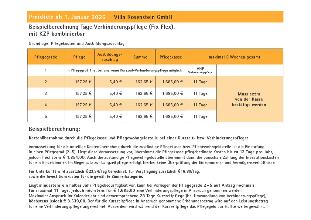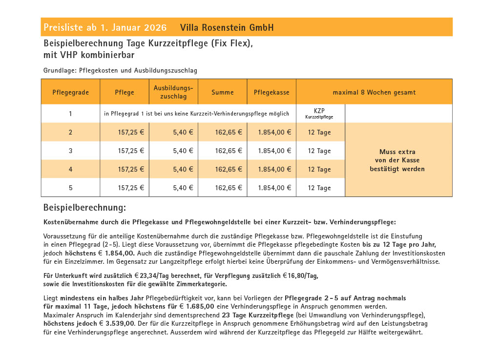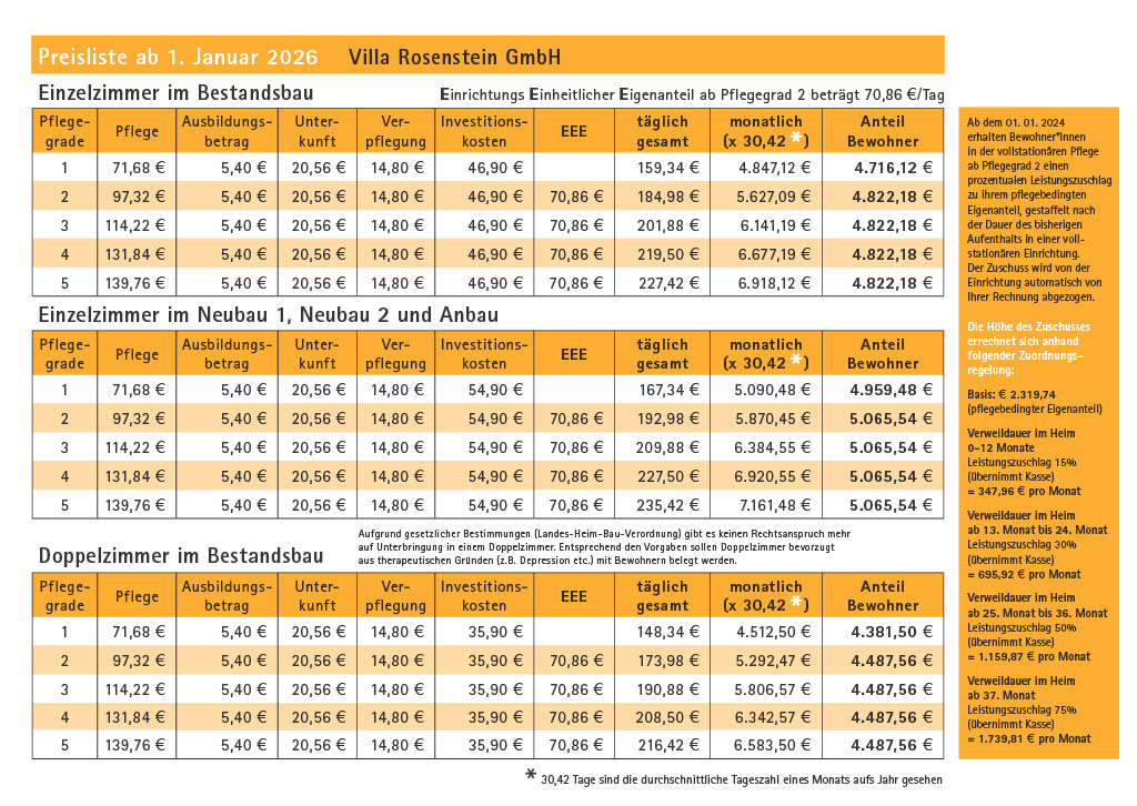 Die Pflege- und Versorgungskosten unseres Hauses entnehmen Sie bitte der untenstehenden Tabelle.